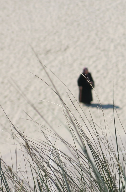 Unsere Zukunft? Oder schon unsere Gegenwart? Ein Wüstenplanet. Bevölkert mit einsamen alten Menschen, die am Stock gehen… Im Vordergrund ein paar Gräser wie eine Art Tarnung: Ist doch alles gar nicht so schlimm, es gibt ja noch Grünes. Aber selbst das Grün wirkt pieksig… .